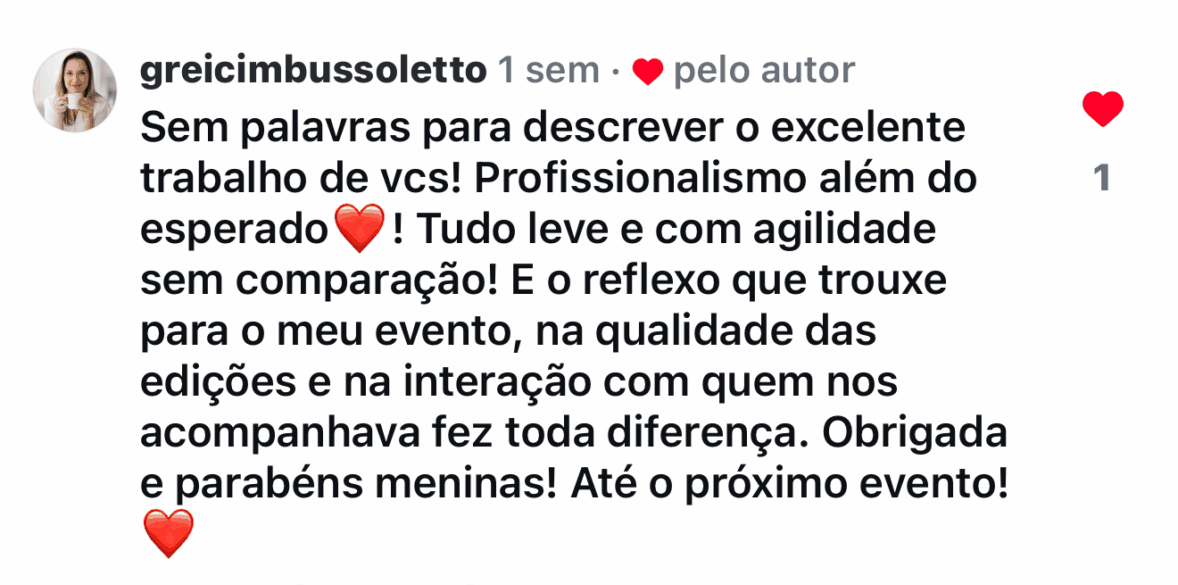 Após o evento nós entregamos um drive completo do Evento, onde você vai receber todos os vídeos, fotos e reels editados, além de todo o material bruto (que pode variar entre vídeos curtos e vídeos mais longos), para guardar, reviver e usar como quiser!